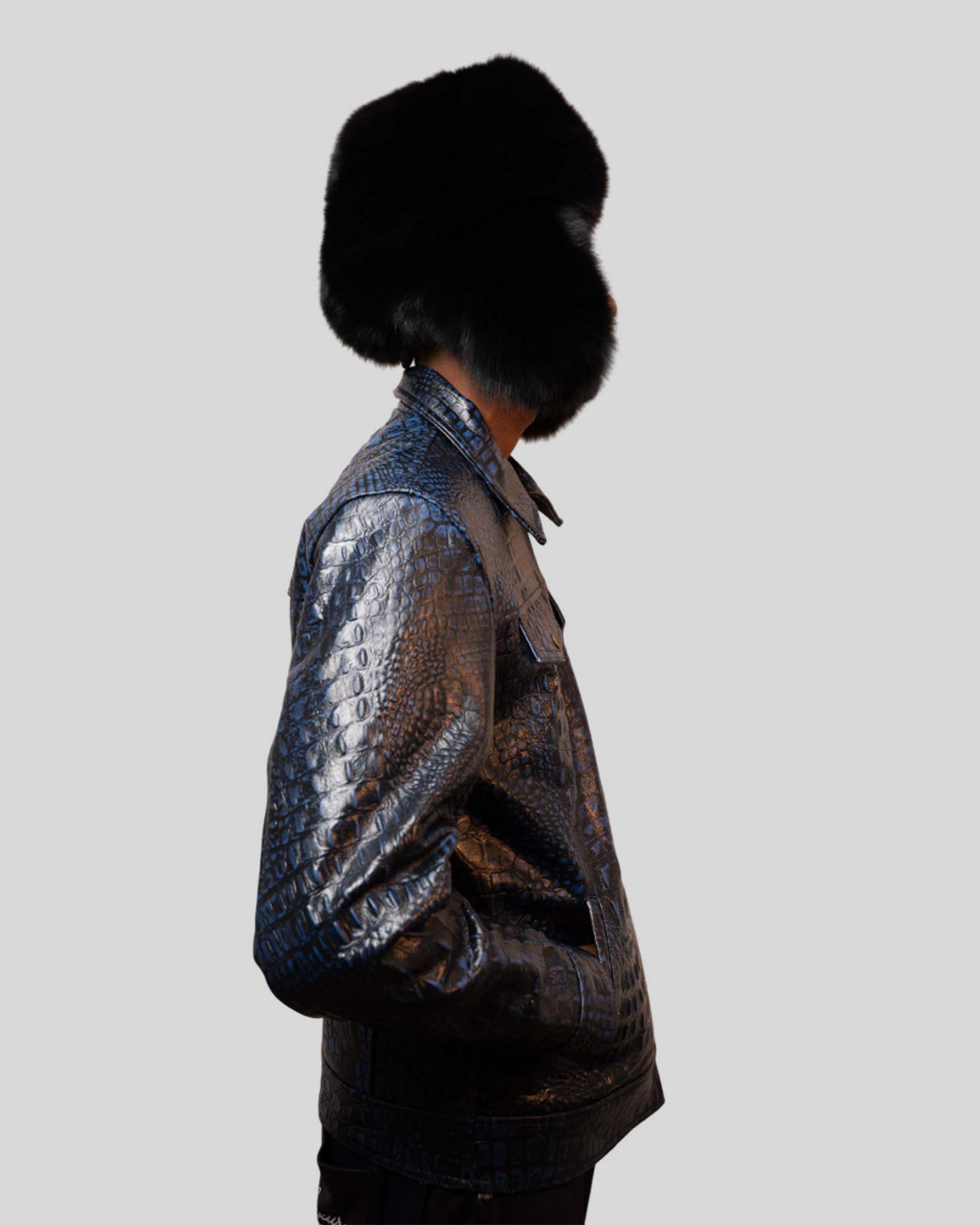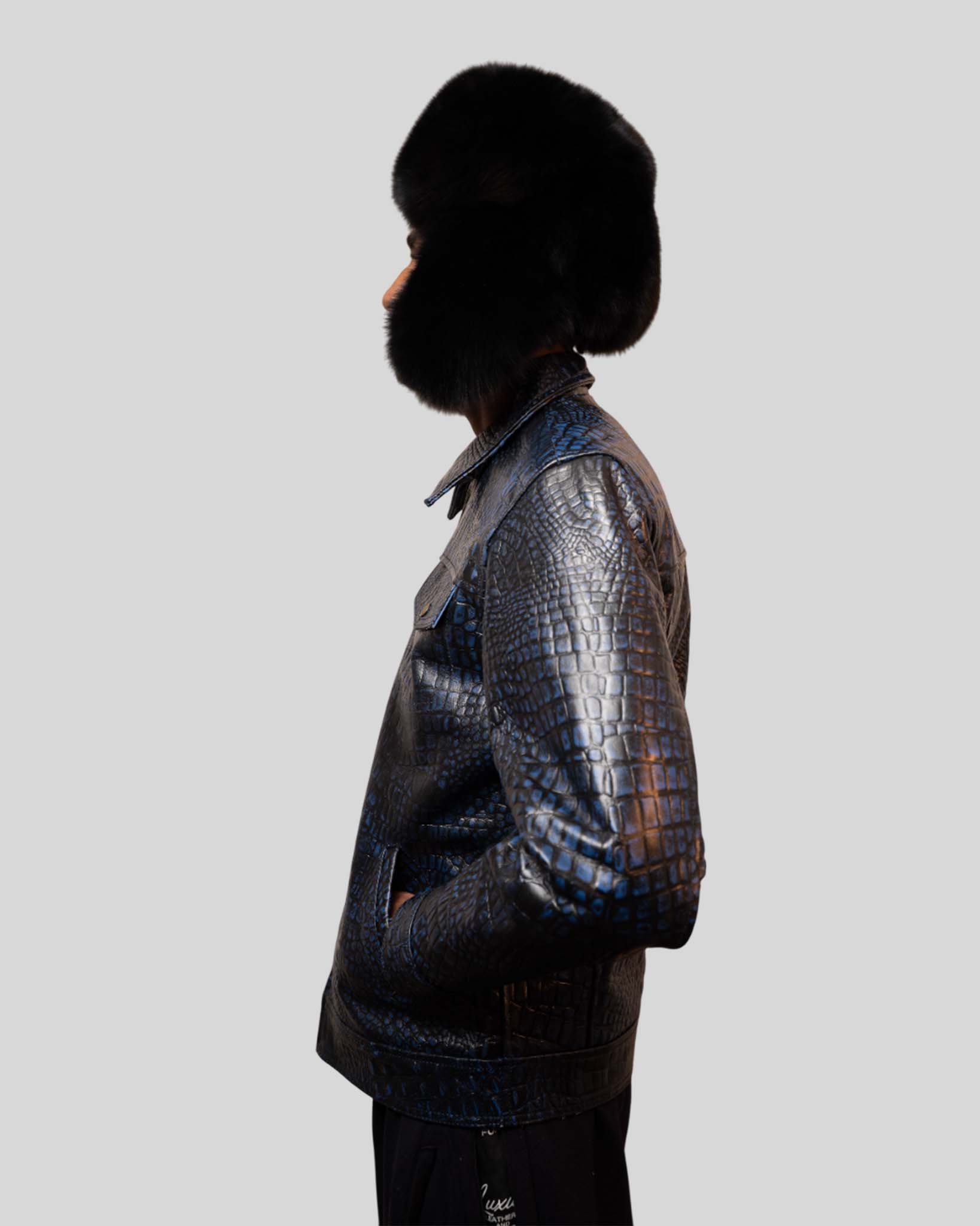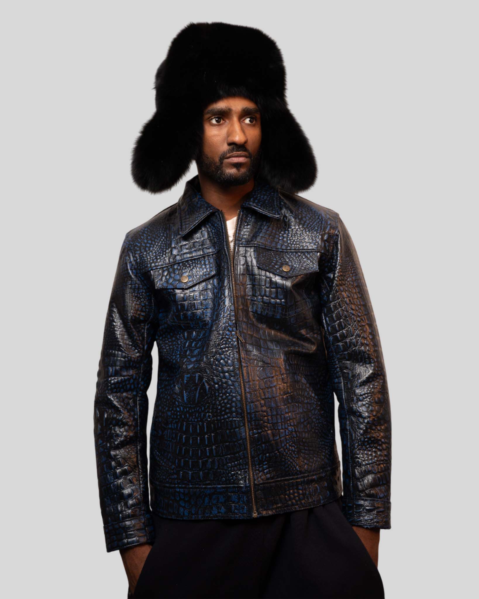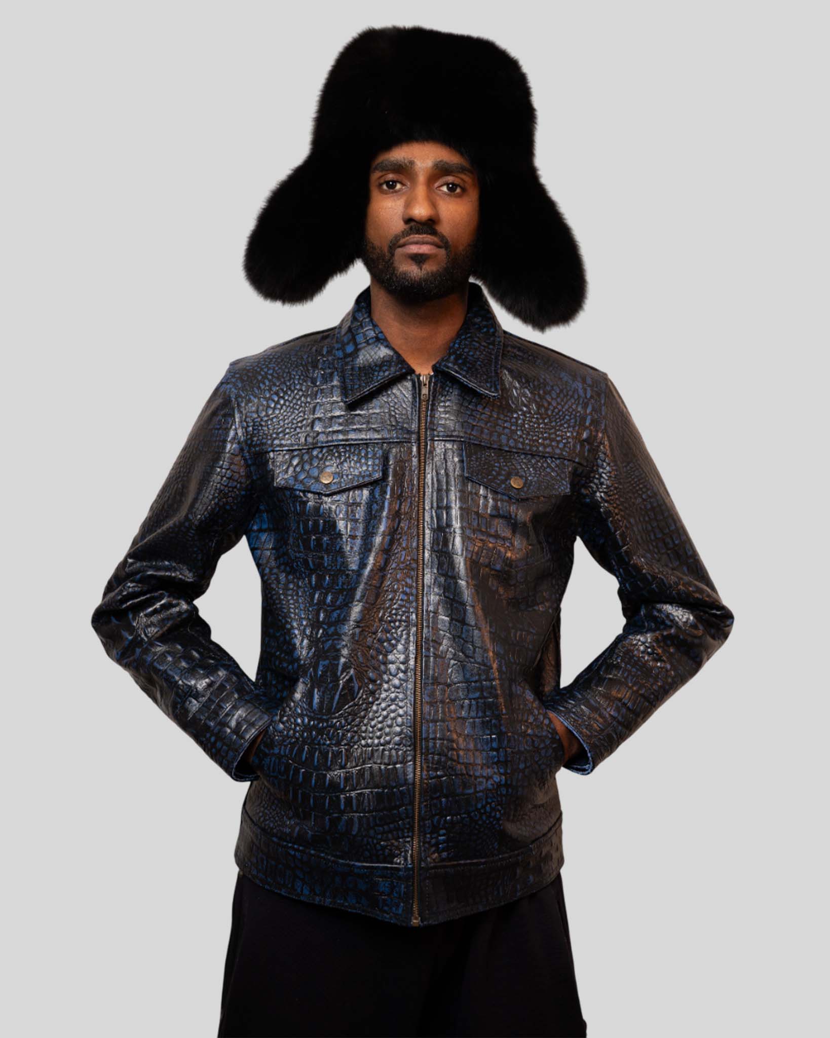 Men’s Luxury Crocodile-Embossed Leather Jacket – Exotic Statement Features embossed crocodile texture with a sleek silhouette, delivering an exotic high-fashion finish. Key Features Crocodile-embossed leather Front zip closure Structured fit Luxury texture