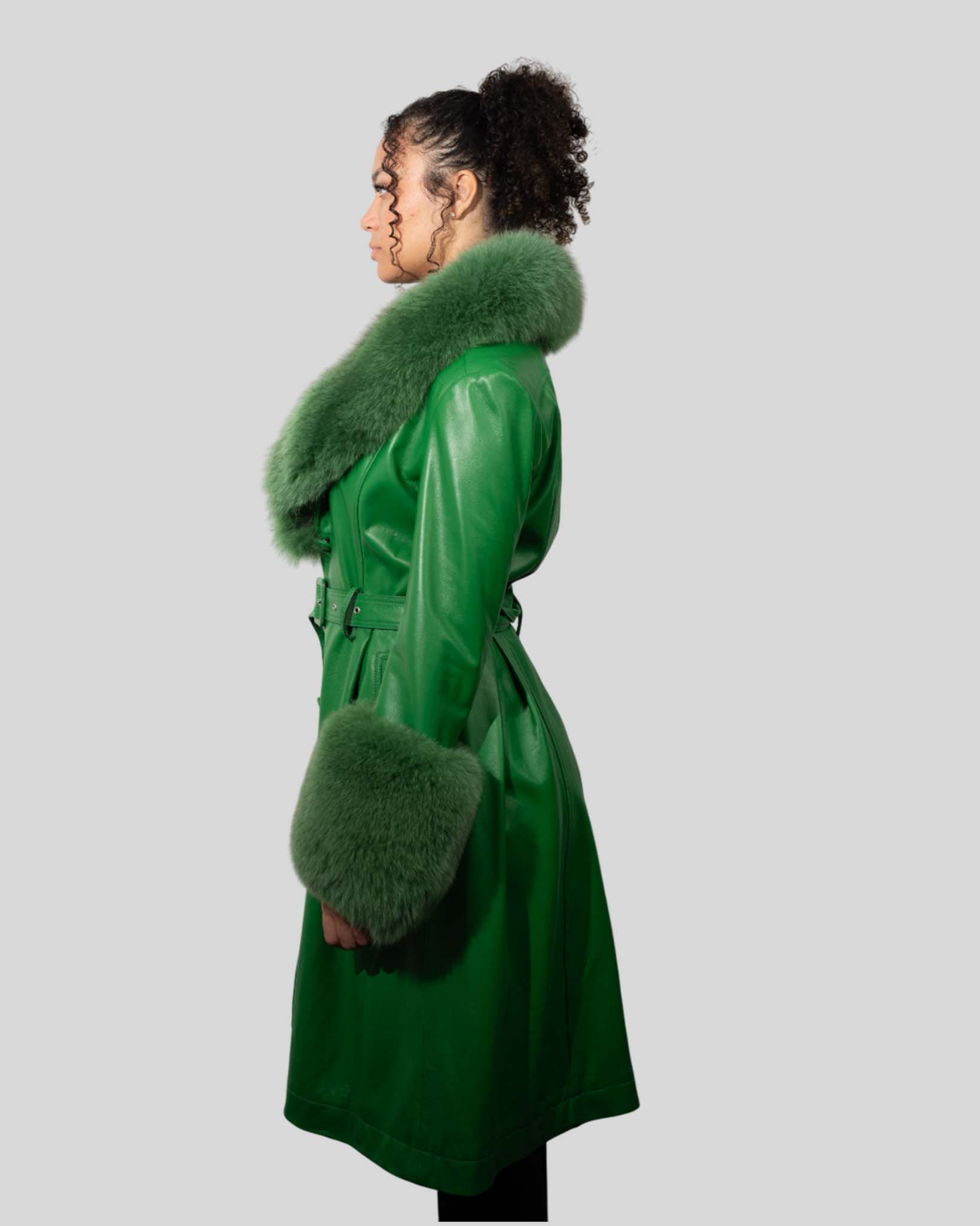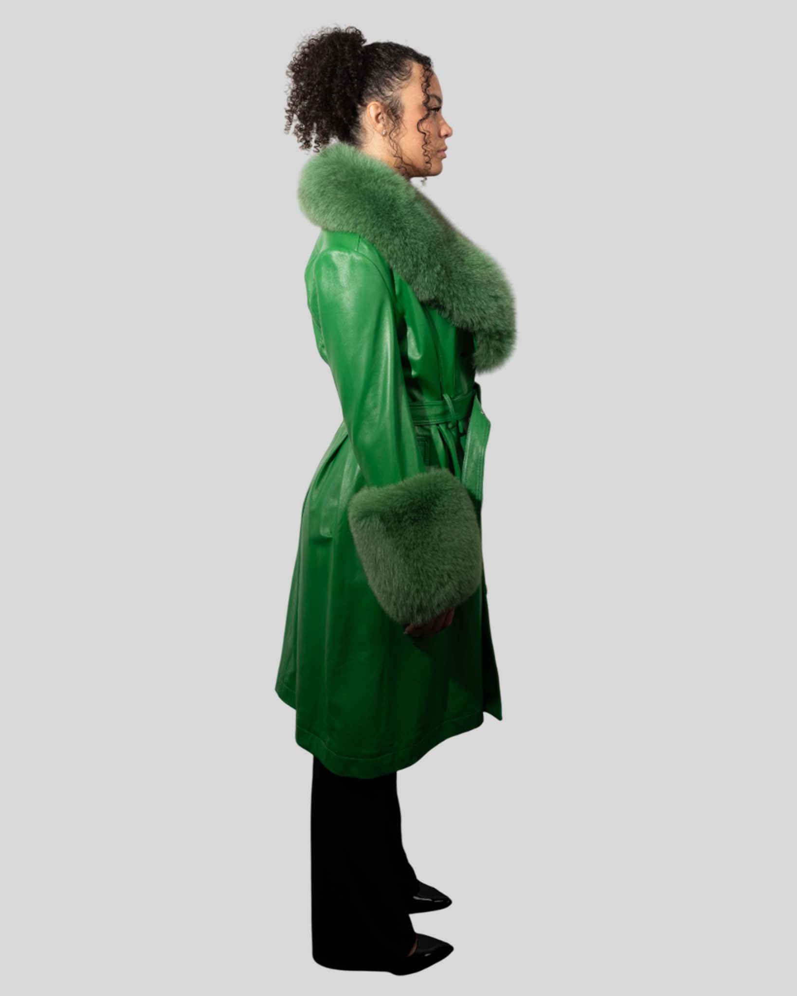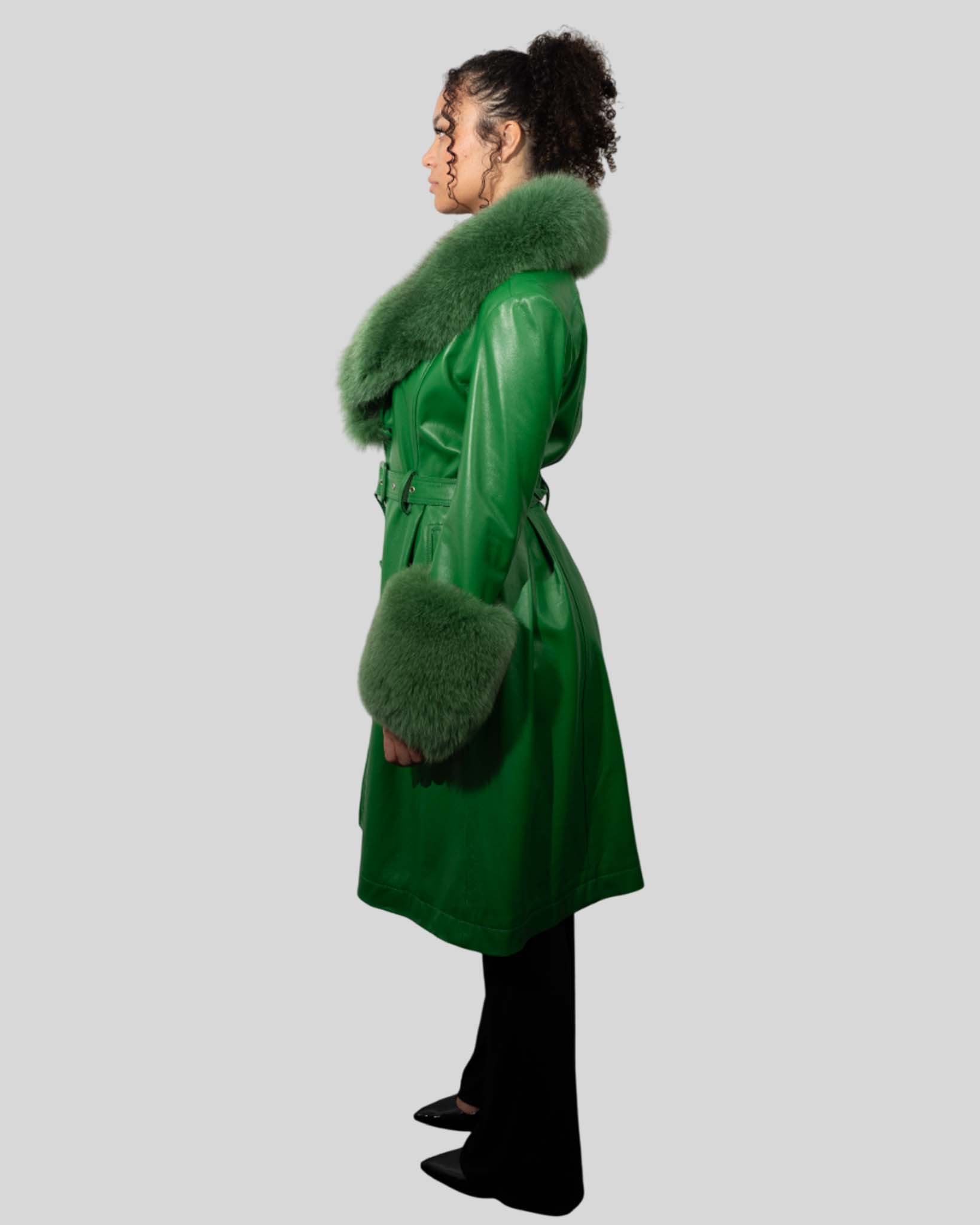 Women’s Luxury Green Fur Leather Coat – Statement Outerwear Blends genuine leather with plush fur for bold, upscale winter fashion. Key Features Genuine leather Premium fur trim Belted style Luxury warmth
