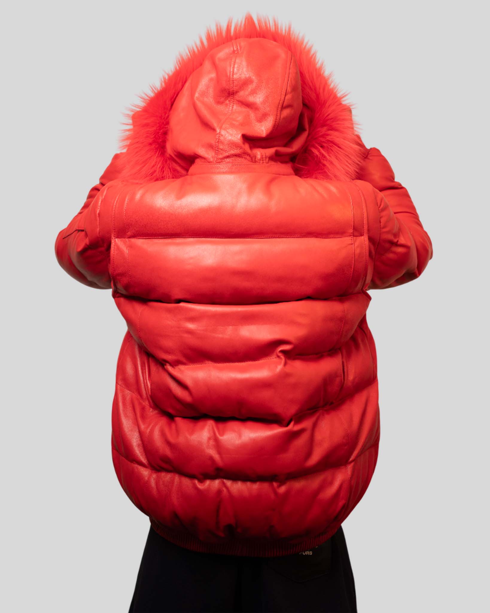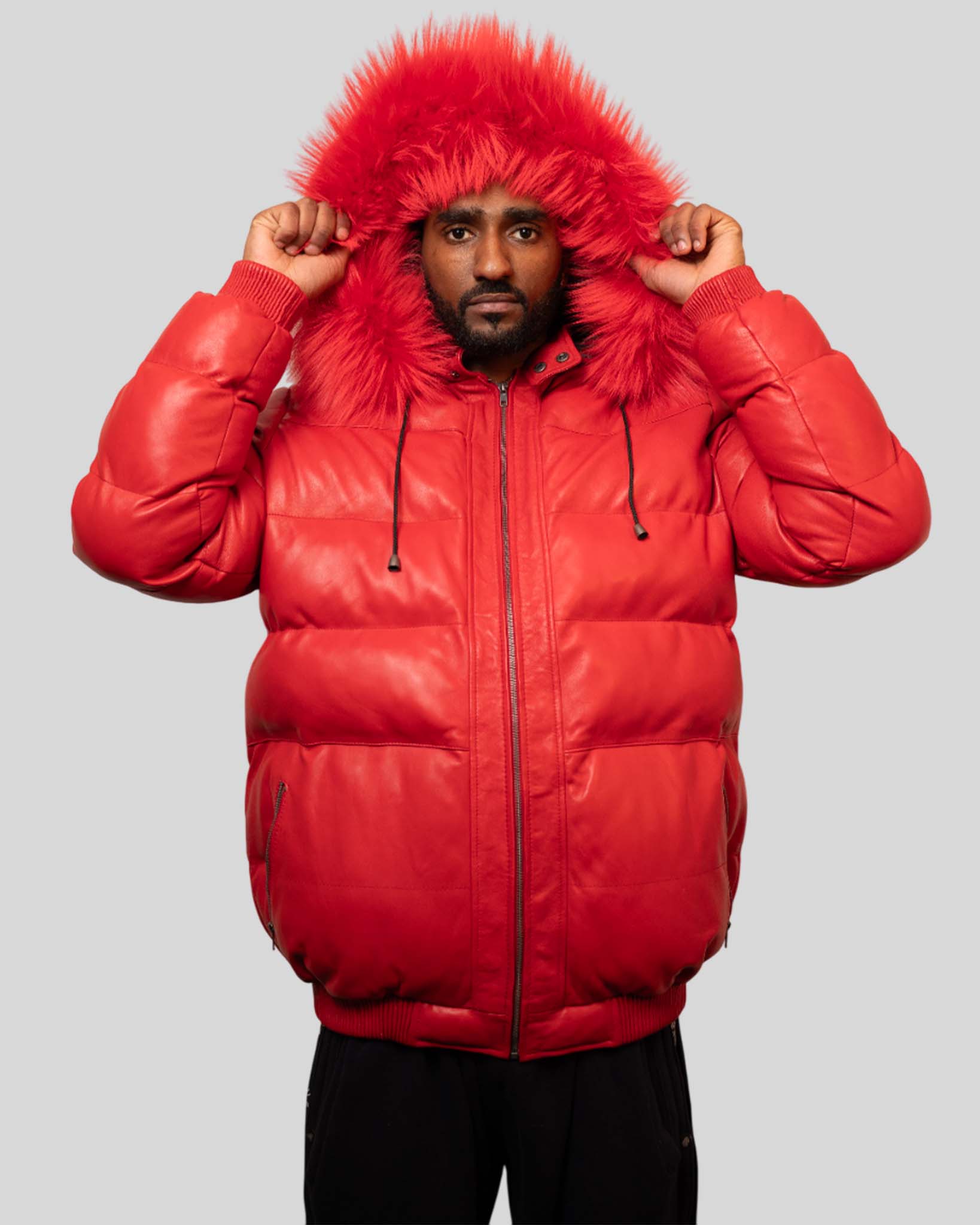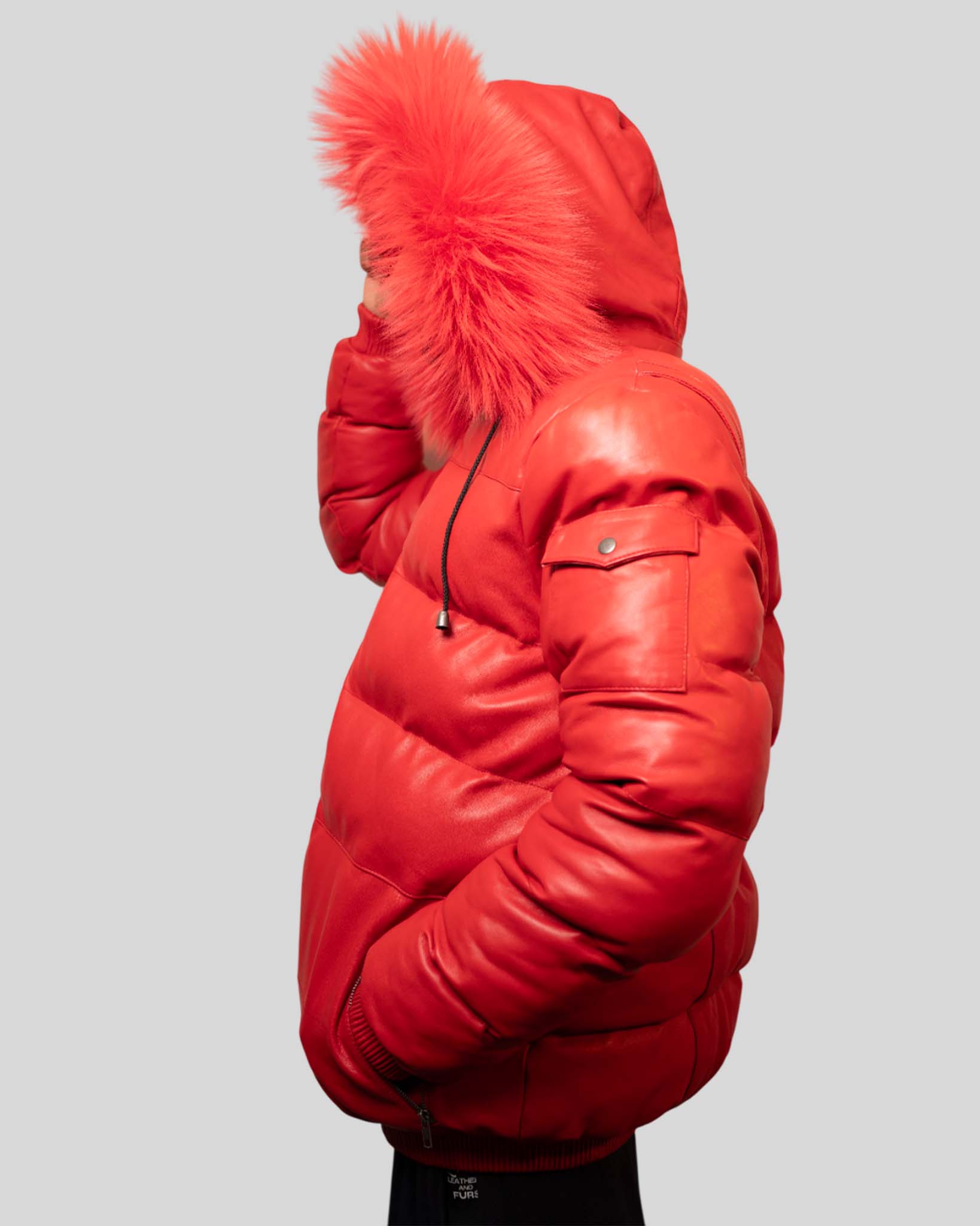A bold red leather puffer jacket finished with a fur-trim hood.
