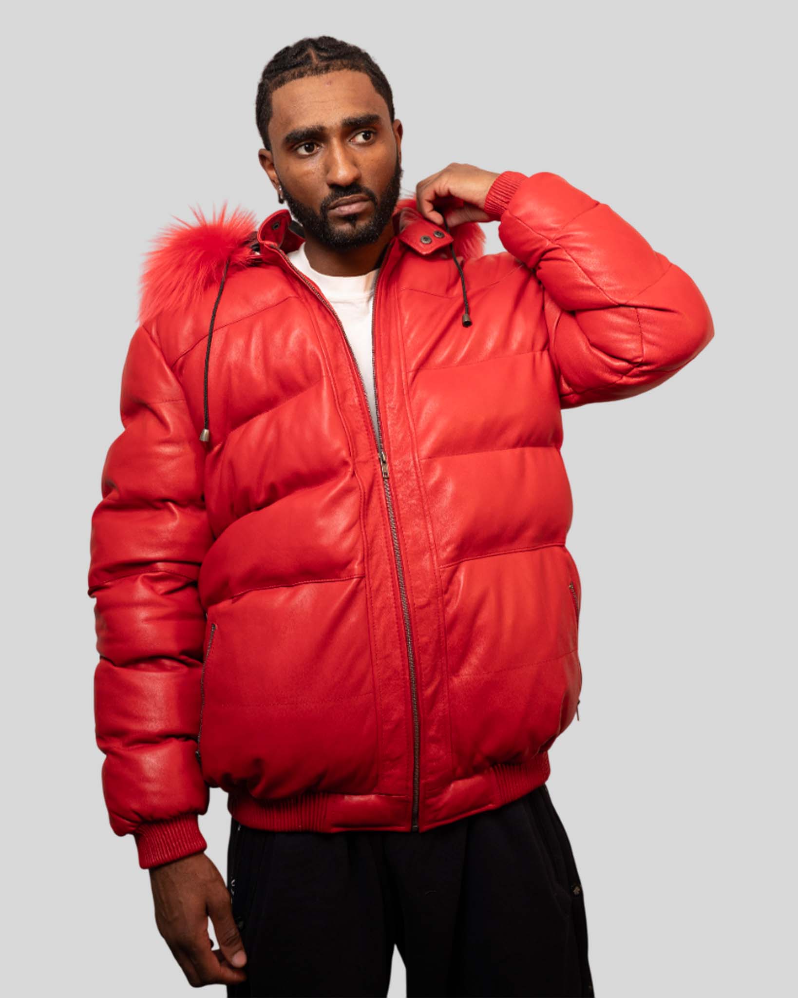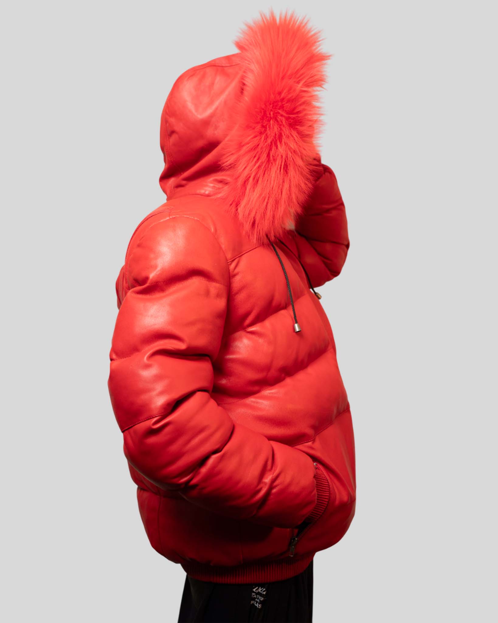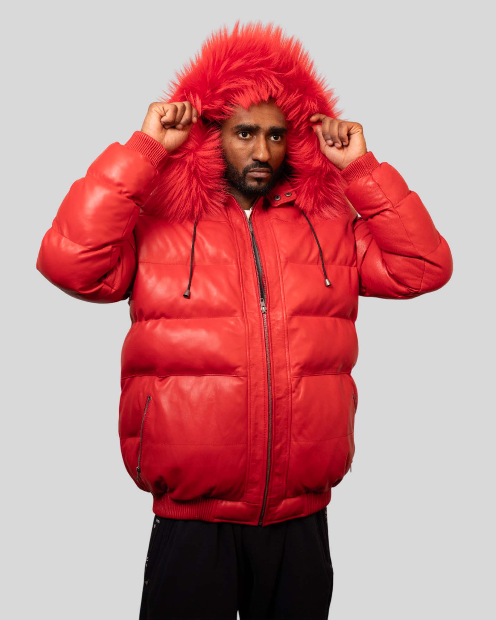 A bold red leather puffer jacket finished with a fur-trim hood.