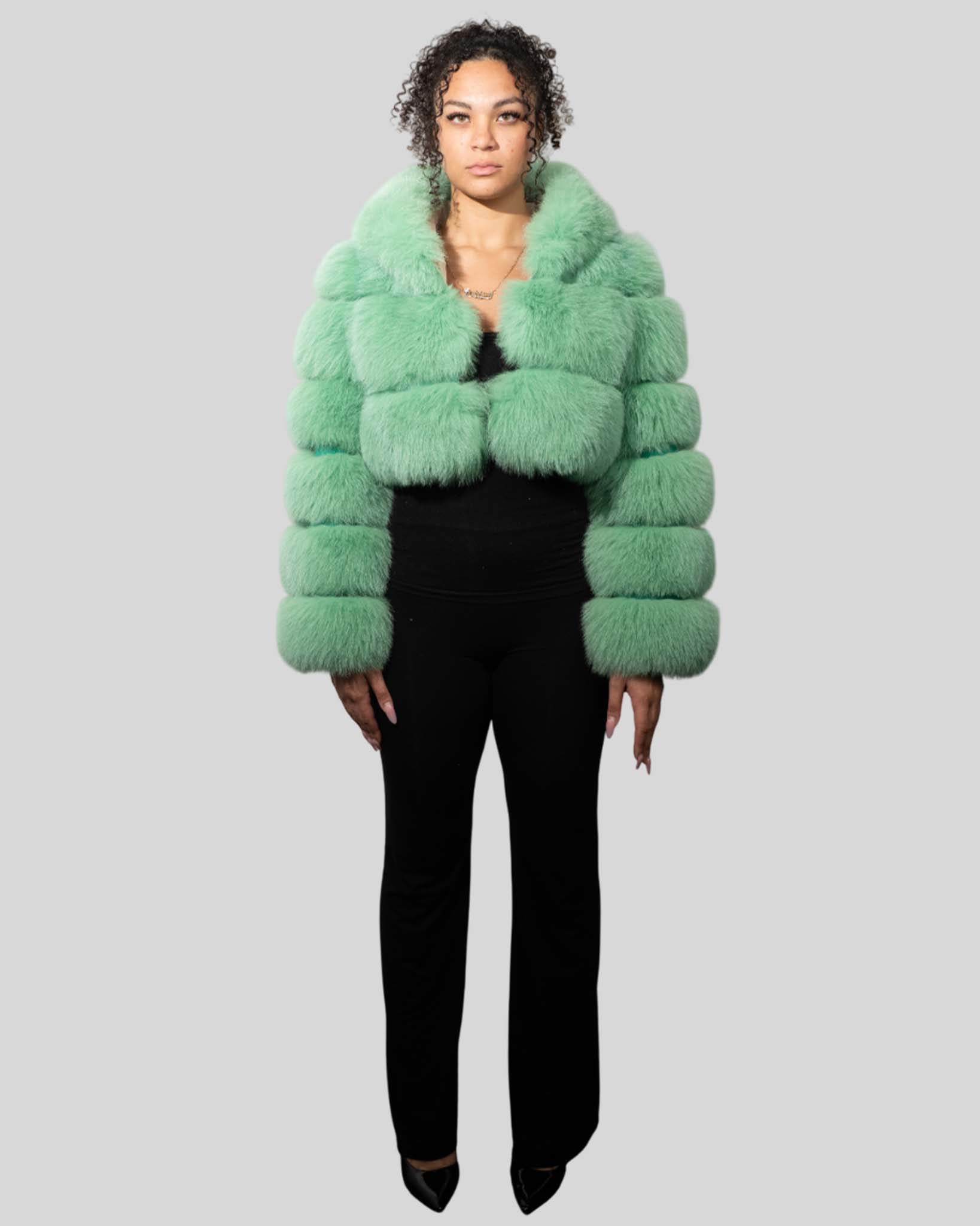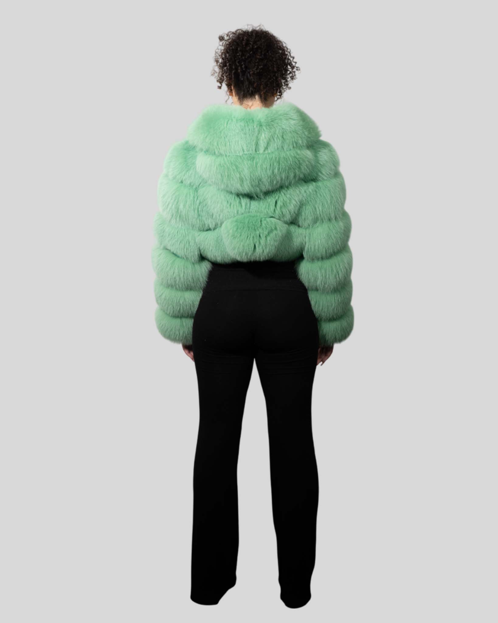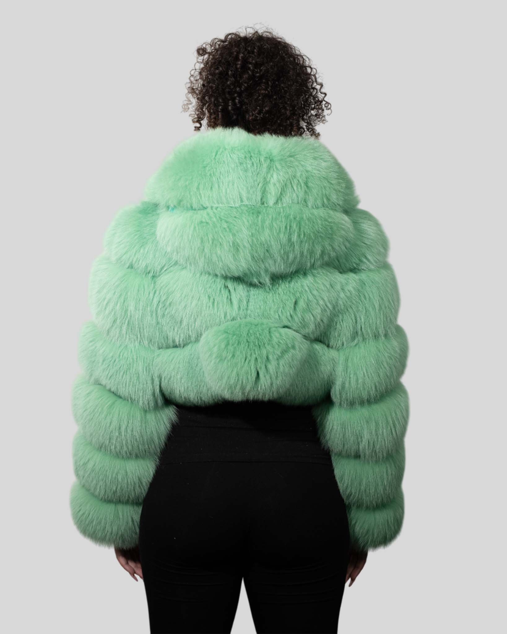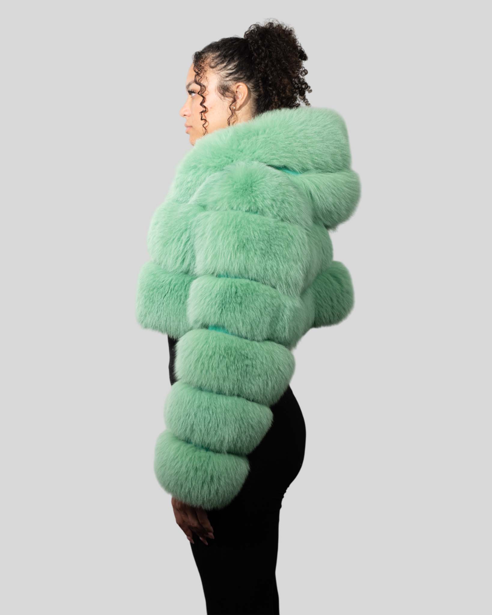 Mint Green Color Fox Fur Jacket With Cropped Hooded Bubble – Womens Crop Top Green Fox Fur Jacket