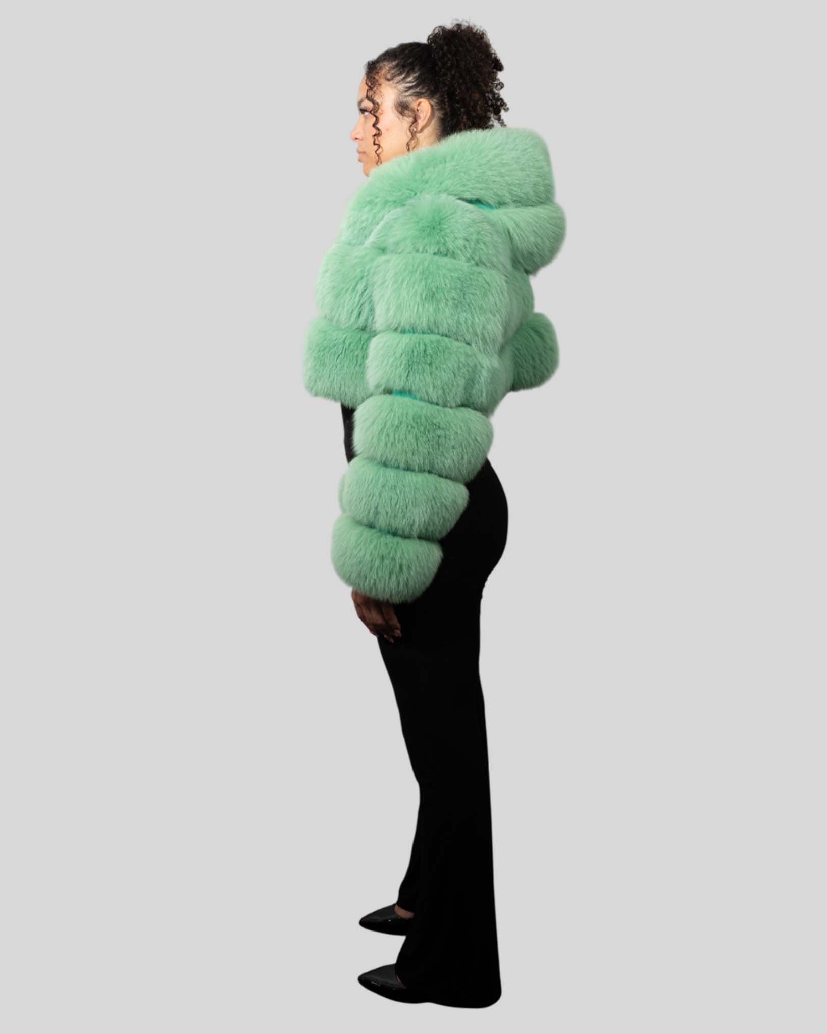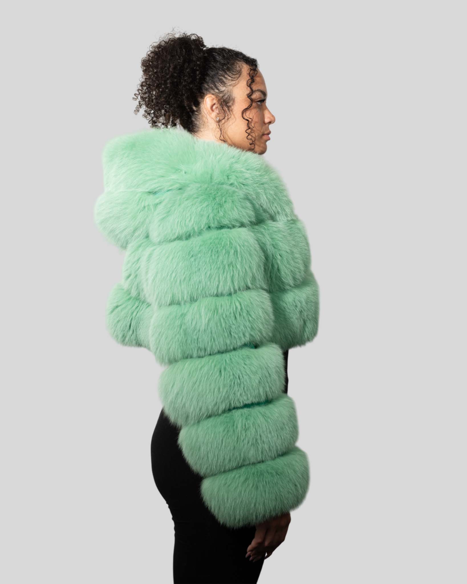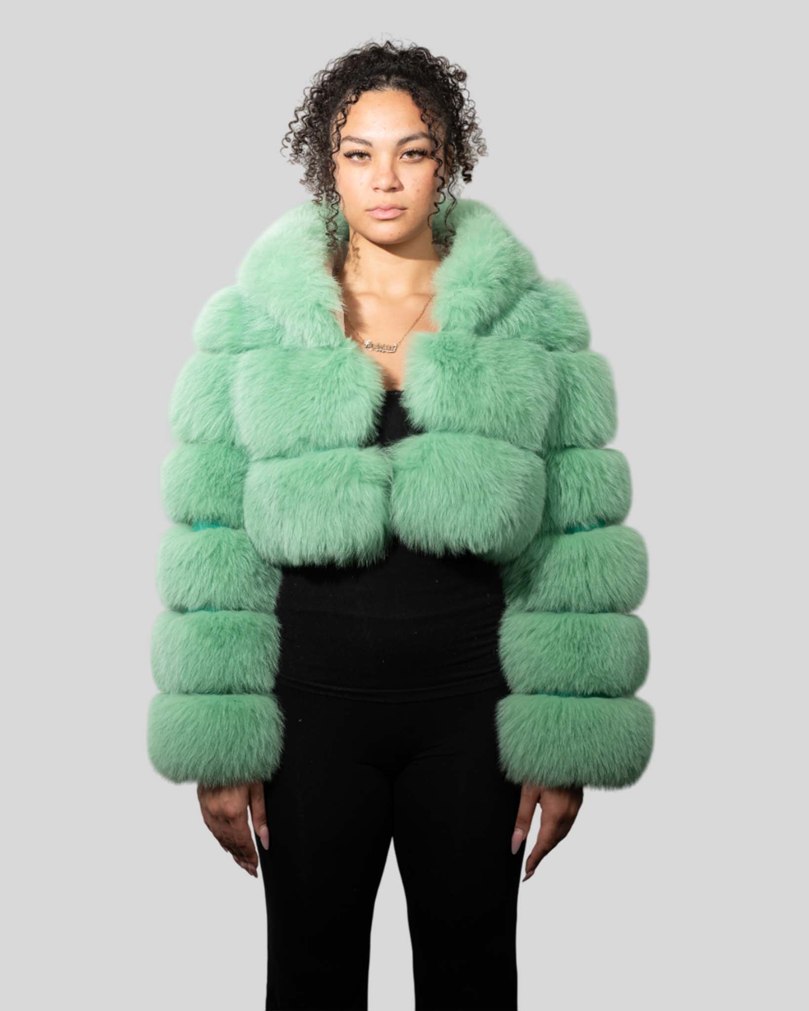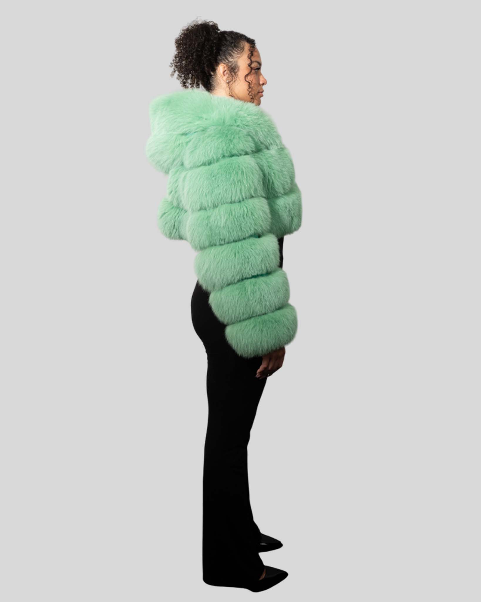 Be the first to review “Mint Green Color Fox Fur Jacket With Cropped Hooded Bubble – Womens Crop Top Green Fox Fur Jacket”