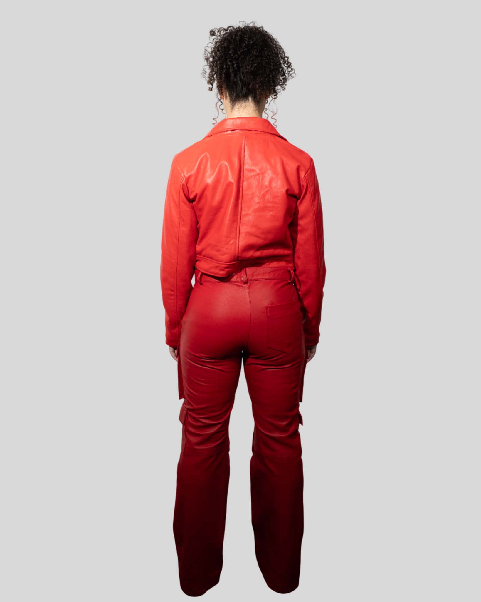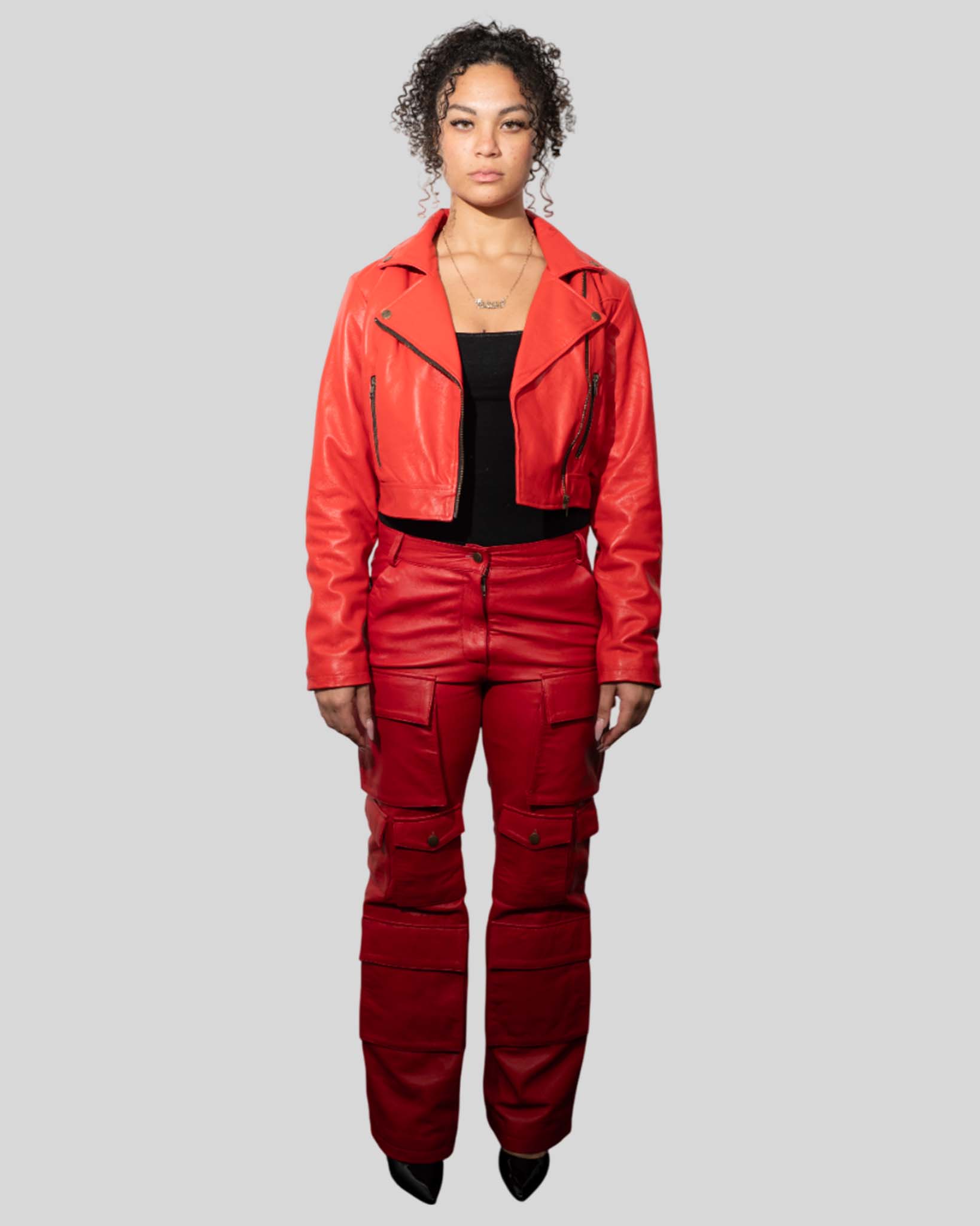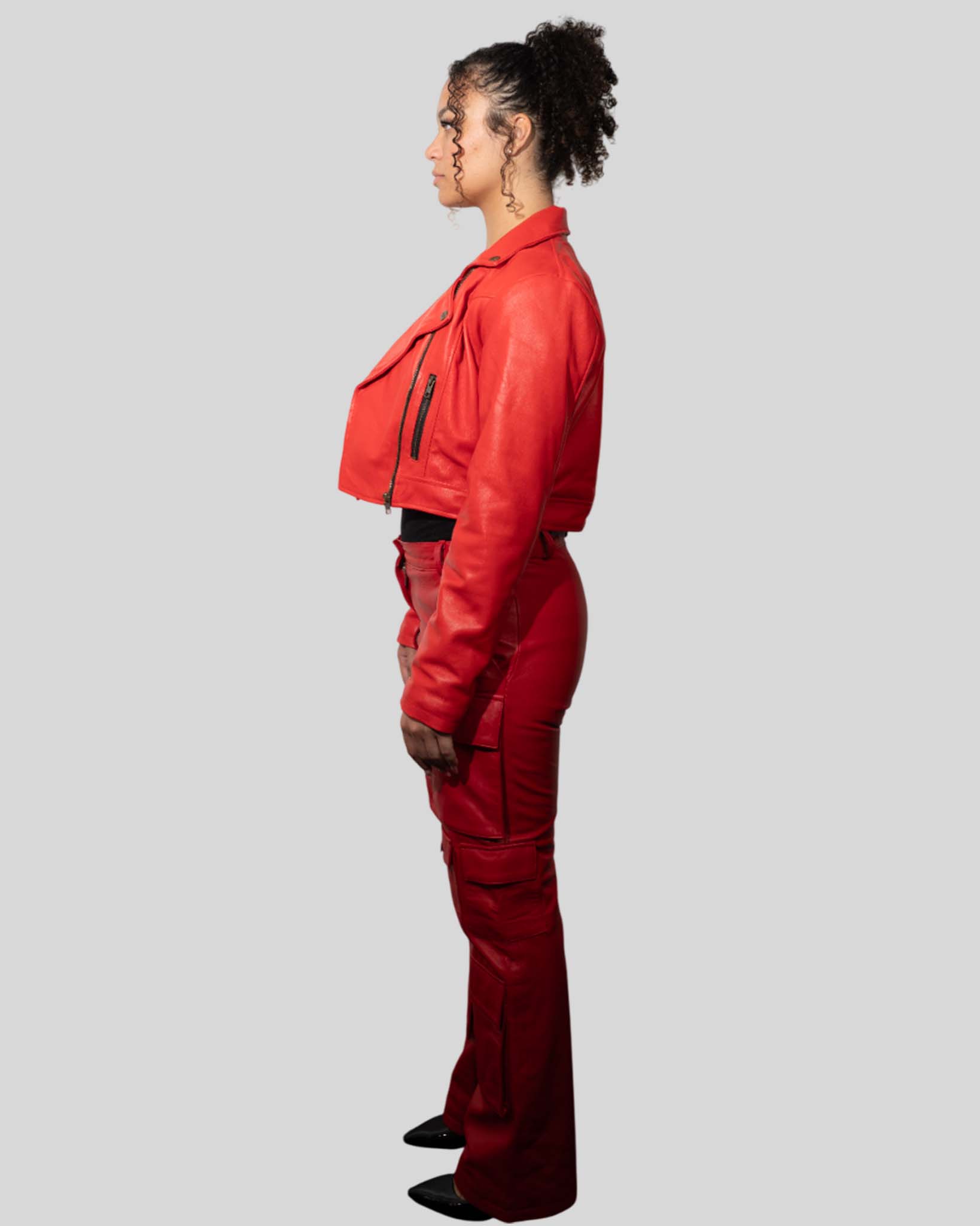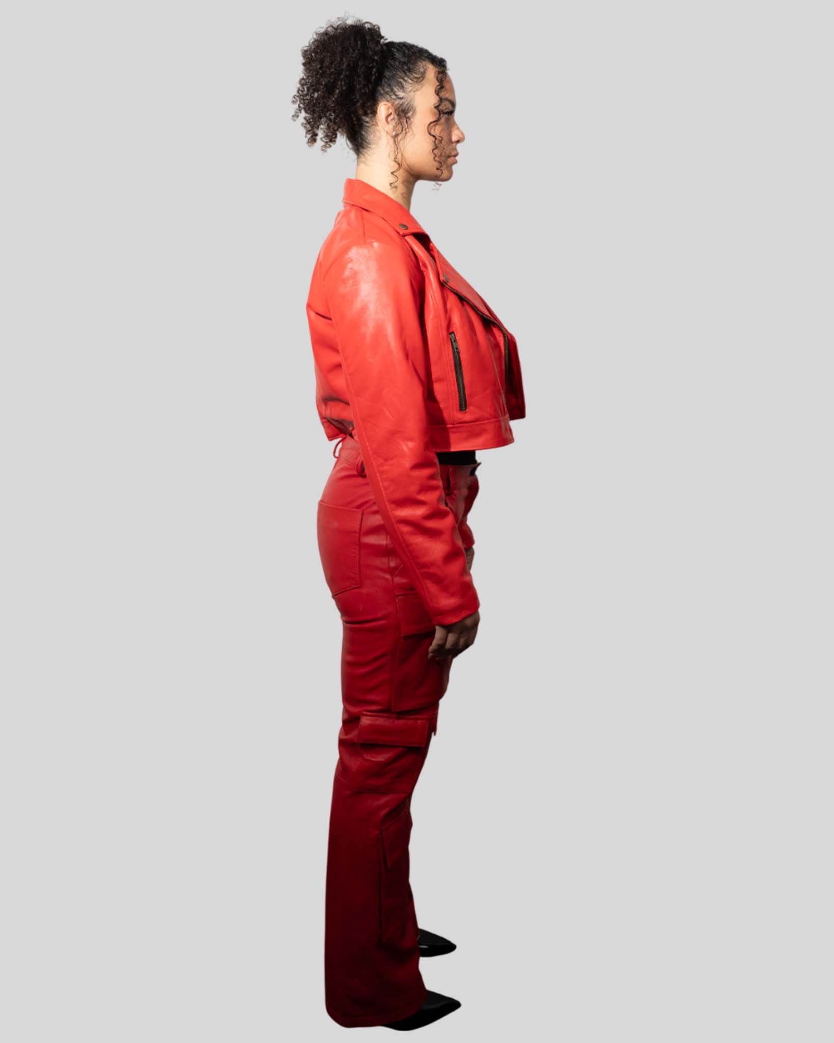 Red Leather Jacket And Red Leather Cargo Pants For Women – Red Leather Suit Set For Womens