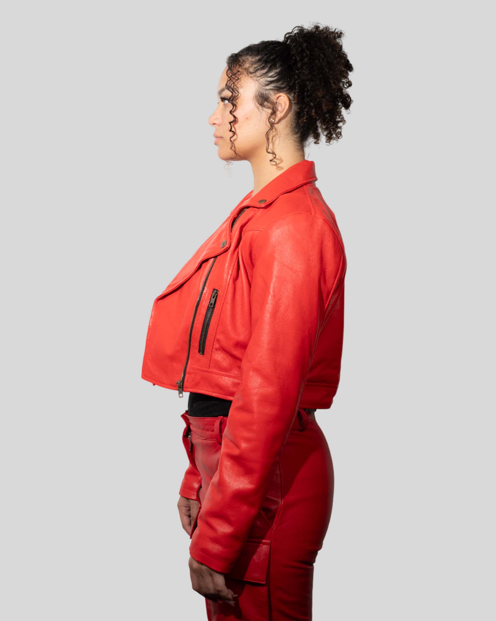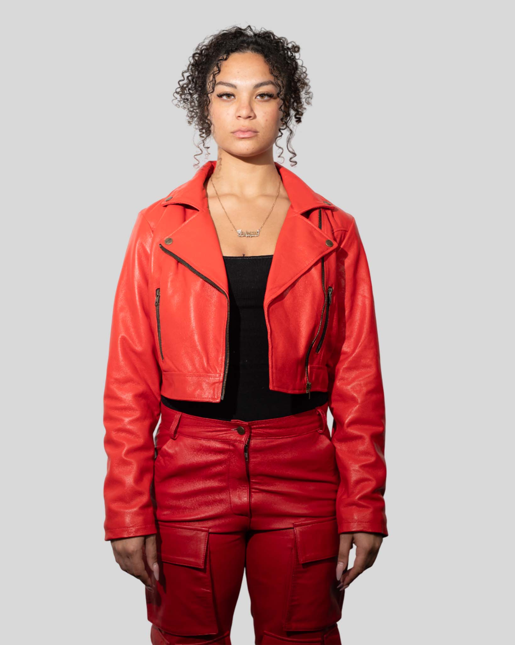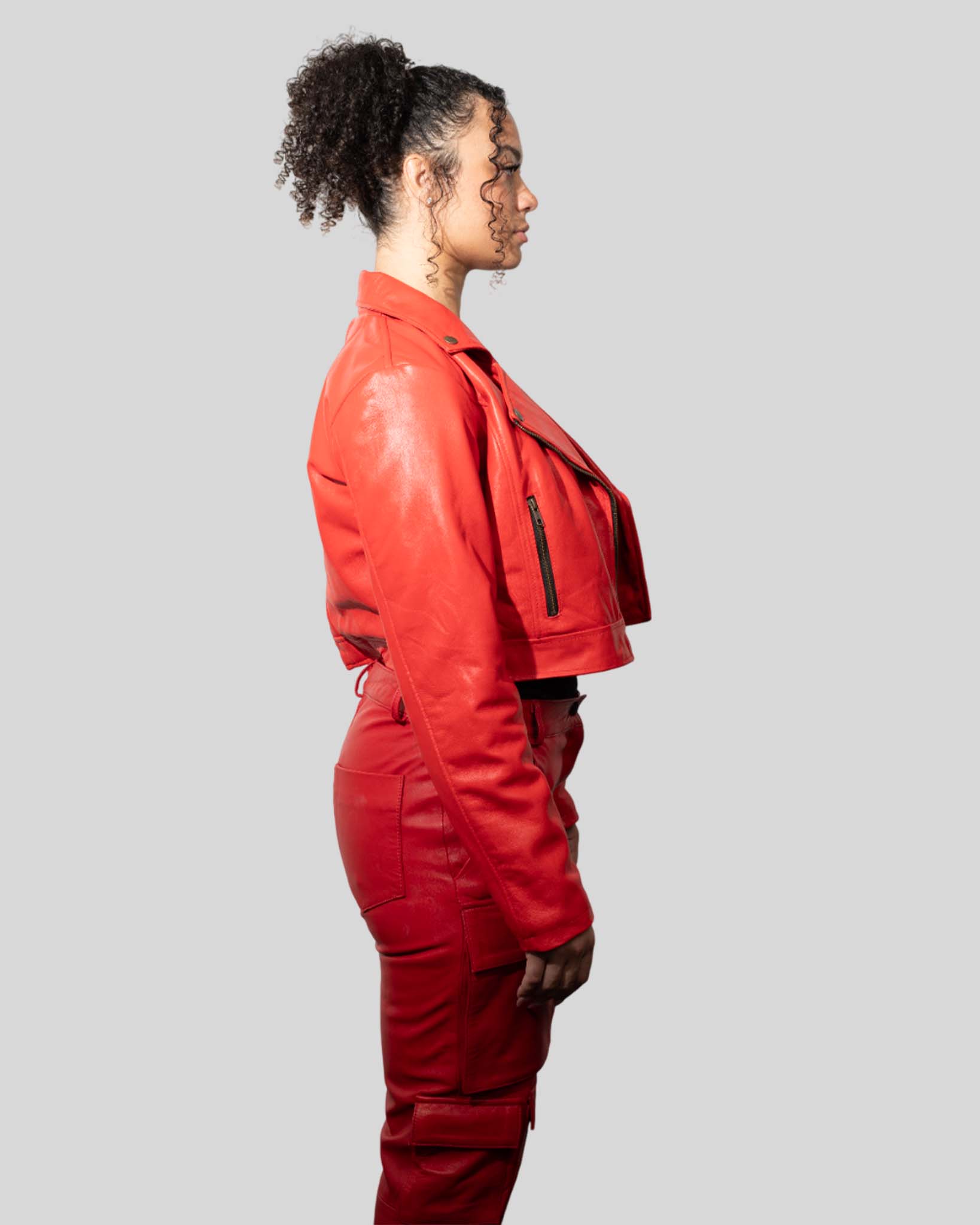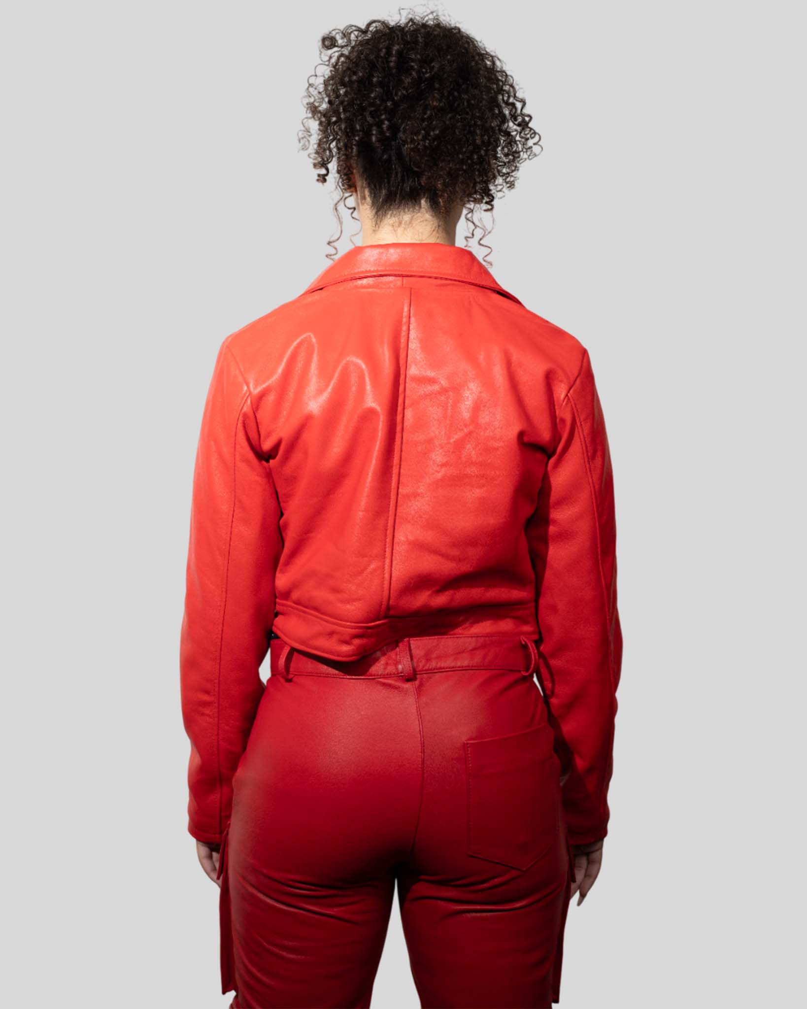 Red Leather Jacket And Red Leather Cargo Pants For Women – Red Leather Suit Set For Womens